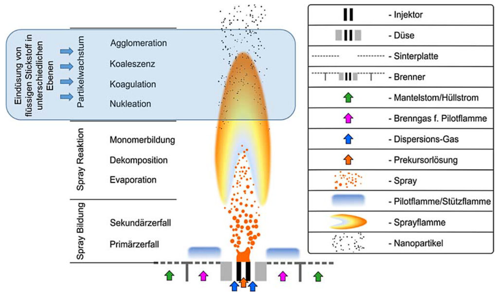 Schematische Darstellung der Sprühflammensynthese. Der Bereich, in dem der flüssige Stickstoff eingebracht wird, ist blau hinterlegt.